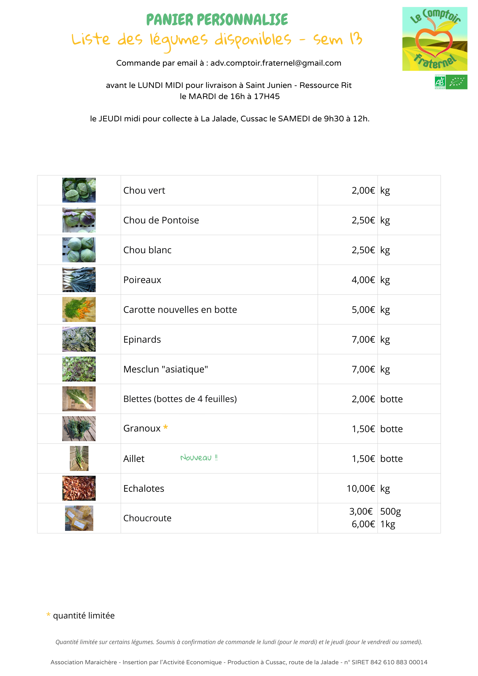 Indiquez-nous pour chaque légume le poids souhaité, le lieu de retrait, votre nom/prénom et numéro de téléphone portable (uniquement afin de pouvoir vous prévenir en cas d’imprévu).